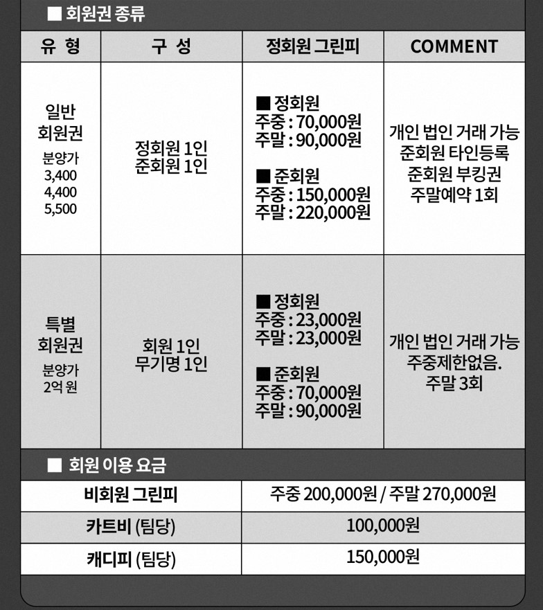 수도권 다른 명문 골프장 대비 비교적 합리적인 시세입니다.